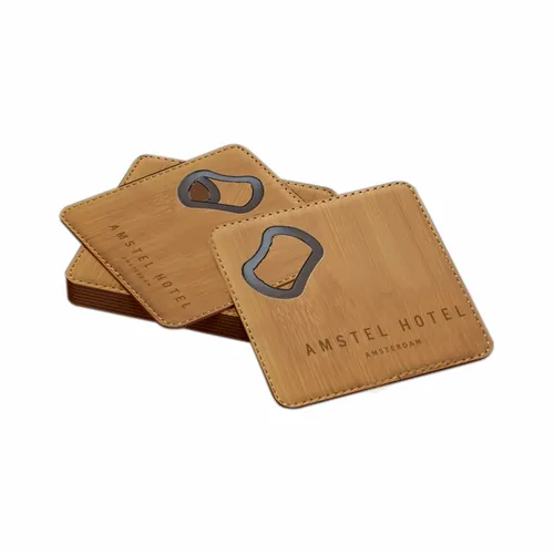 - Bestel je eigen Leren Flesopener Onderzetter. Verbeter uw manier van geschenken geven en het promoten van uw bedrijf. Met deze nieuwe onderzetter kun je je eigen lay-out maken voor het ontwerp dat blijft hangen in huizen, restaurants, bars en andere gelegenheden die je maar kunt bedenken. Deze multifunctionele onderzetter kan een versiering zijn en beschermt tegelijkertijd het tafelblad tegen watervlekken. Personaliseer je onderzetter nu en maak indruk!